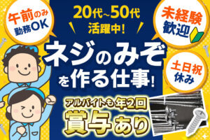 三木にある『株式会社蒼龍刃物製作所』でネジにミゾを作る簡単なモクモク・こつこつ軽作業STAFF募集☆男女問わず未経験大歓迎◎20代~50代まで幅広く活躍中です!正社員デビューもOK*工場や製造が初めてでも大丈夫◎難しいスキルや経験も一切必要ありません!