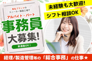 姫路にある『塩谷工業株式会社』で総合事務スタッフ募集♪有名ブランドのスニーカー製造工場で、人気の総合事務/オフィスワークに挑戦してみませんか?経理や営業事務、一般事務など、幅広い業務に関われるポジションです!未経験の方も、基本的なPC入力ができればOK◎扶養内勤務もOK◎車通勤OKで通いやすさも◎