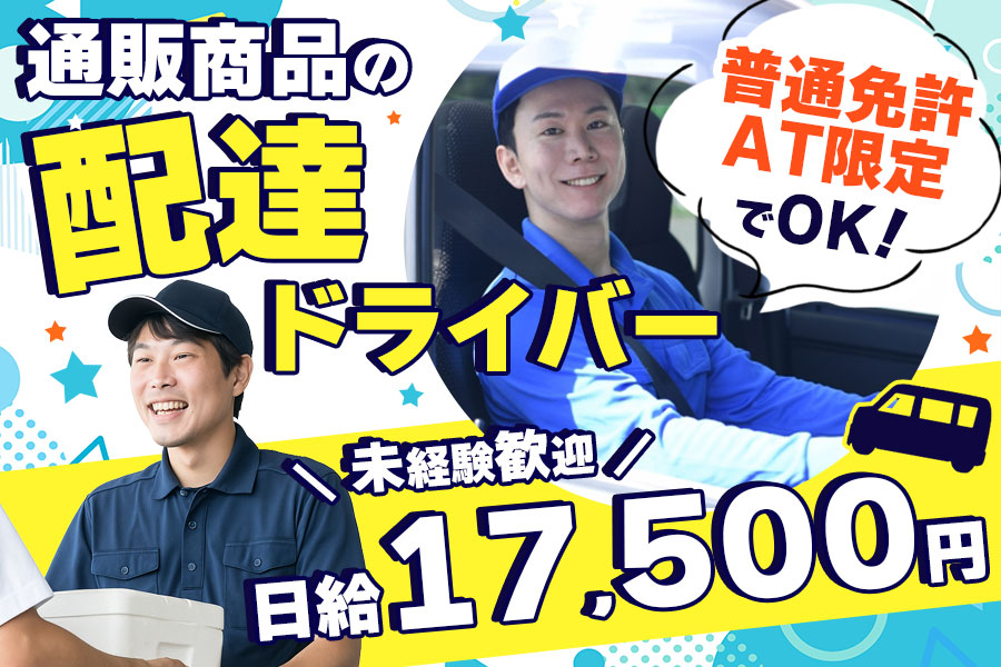 | 経験・資格 | 【必須】 ◆普通免許(AT限定OK!) ◆未経験OK! ◆主婦(夫)・フリーターさん大歓迎! ◆Wワークの方大歓迎! ◆ブランクOK! \こんな方はぜひご応募ください!/ *空いた日の有効活用がしたい! *車の運転が好き! *モクモクとできる作業が得意♪ |