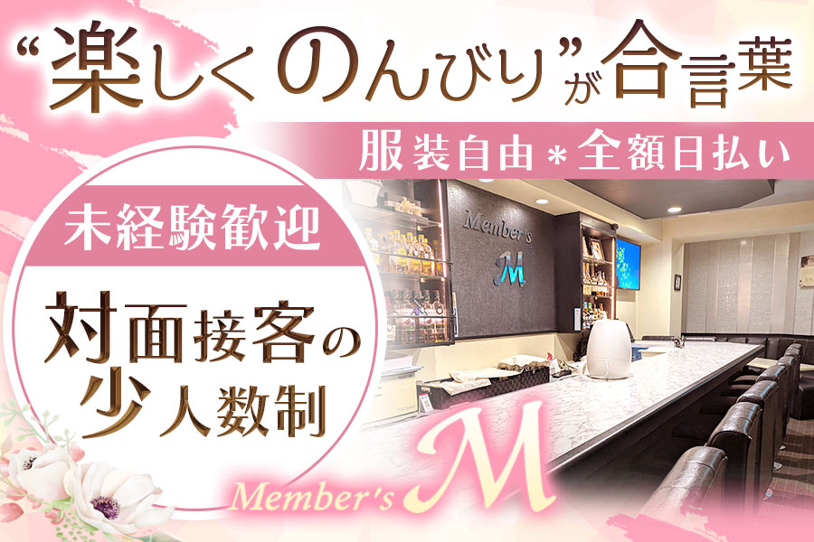 尼崎にあるスナック『メンバーズM(エム)』でカウンターレディを大募集♪『楽しく、のんびり♪』をモットーに、24年営業している安心店♪お客様は何度も来てくれる常連さんばかりだから、難しい接客はありません★ノルマや罰金などの厳しいルールも一切ないので、ママのカンタンなお手伝いのみでOK♪テーブル越しの対面接客です◎