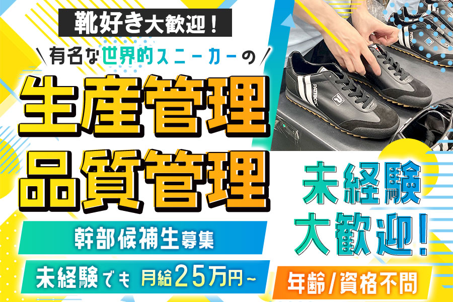 | 仕事内容 | 世界的なスポーツシューズメーカーのスニーカーを製造する工場で 生産管理・品質管理のお仕事をお任せします!(幹部候補) <具体的には…> ・スニーカーの素材や材料の選定、海外調達 ・書類作成など事務作業 ・検品、梱包 ・靴のデザイン(希望者の方) 今回の募集は幹部候補生のため、 将来的には管理業務全般をお任せします。 必要な資格・経験はゼロ。 「やってみたい」で応募してOK! まずはシューズの製造工程を1か月間研修。 その後、先輩社員と同行して 実際のお仕事の流れを学んでいきます。 初めから全てをお任せすることはありませんので、ご安心ください! |
