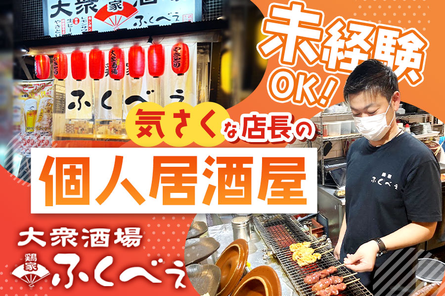 姫路駅前で長く続く常連さんが多い大衆酒場『鶏家ふくべえ』でホール・キッチンスタッフ募集★席数30席ほどの小さなお店◎スタッフ同士の雰囲気も良く、働きやすい環境!\姫路駅チカ4分!/フリーター・学生さん中心に活躍中★未経験でもやる気があれば全然大丈夫☆髪色・ピアスなどオシャレ自由!絶品まかないあり♪