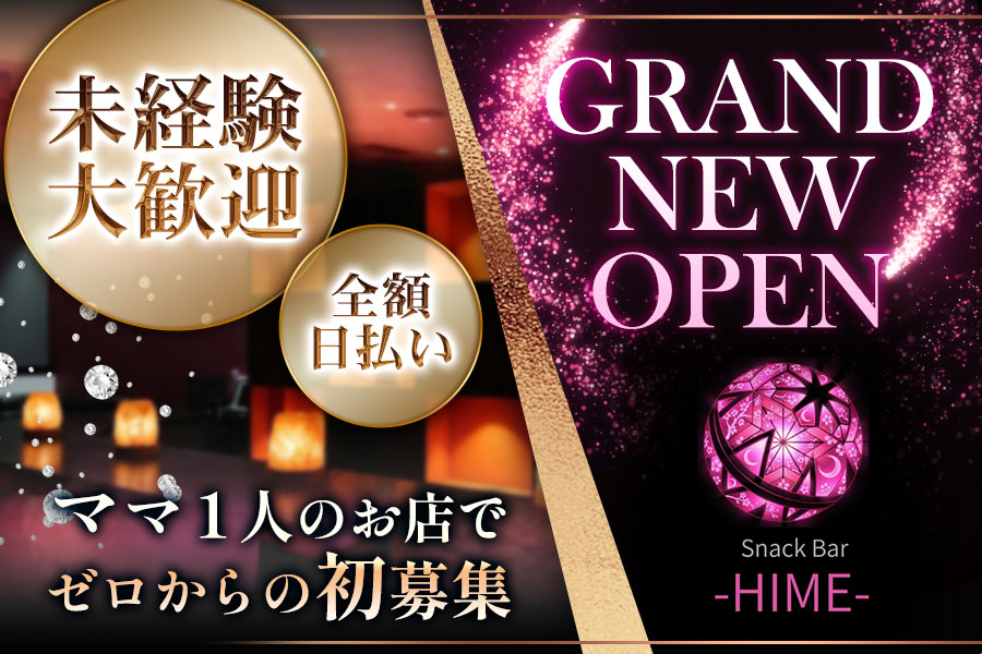 姫路に3月5日GRAND OPEN予定の新店「Snack Bar Hime-ヒメ-」でオープニングスタッフを初募集♪現在ママ1人のお店で、1期生デビューしませんか♪集まった女の子を“お姫様”みたいに大切にしたい、そんな想いで始まるお店です!完全対面接客でノルマ・罰金なし!女の子目線の待遇勢ぞろい◎全額日払いOK!送迎ドライバーも募集中★