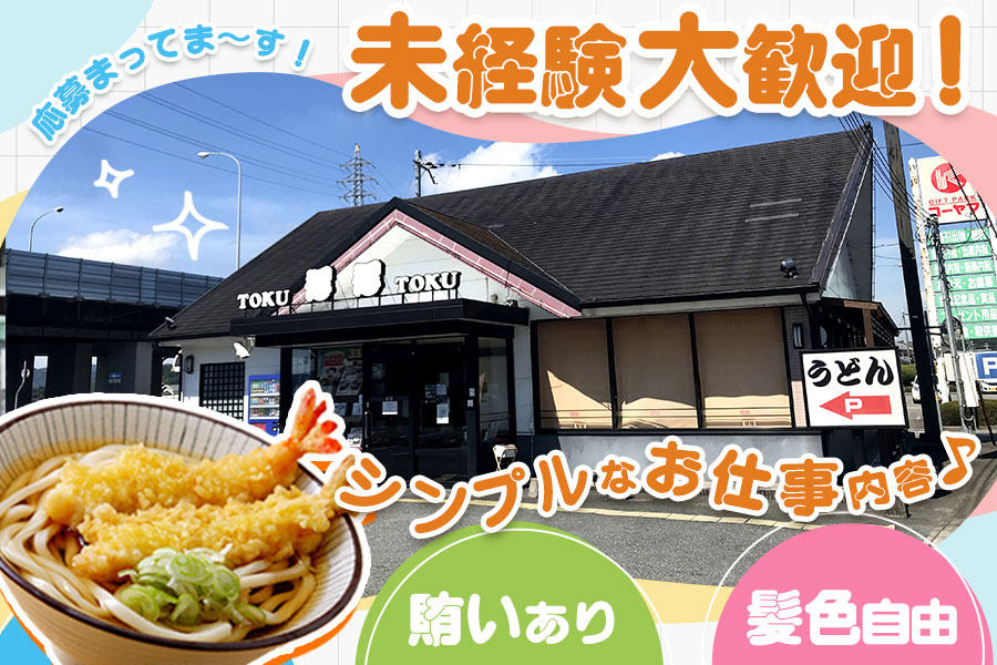 龍野で人気のうどん屋さん「得得 龍野店-とくとく-」でホール・キッチンスタッフ募集★\シフト融通抜群/で学業・家庭と両立しやすい♪土日祝時給UP★大学生・主婦さん活躍中★お仕事はとってもシンプル♪【オーダーを取る → うどんをゆでる → 天ぷらを盛り付けるだけ♪】初バイト・未経験でも安心です♪絶品賄いあり★