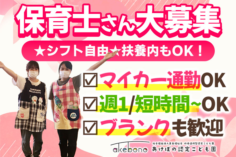 三木にある『真生福祉会 あけぼの認定こども園』で保育士さん募集♪業務はシンプルで、バタバタせず落ち着いて働けます♪ゆったりとした環境の中で子どもたち1人1人と向き合えます!週1日・短時間~OKなので、自由な働き方が叶います!50代・60代の方も活躍中です!\朝・夕の時間帯に入れる方、積極採用中です◎/