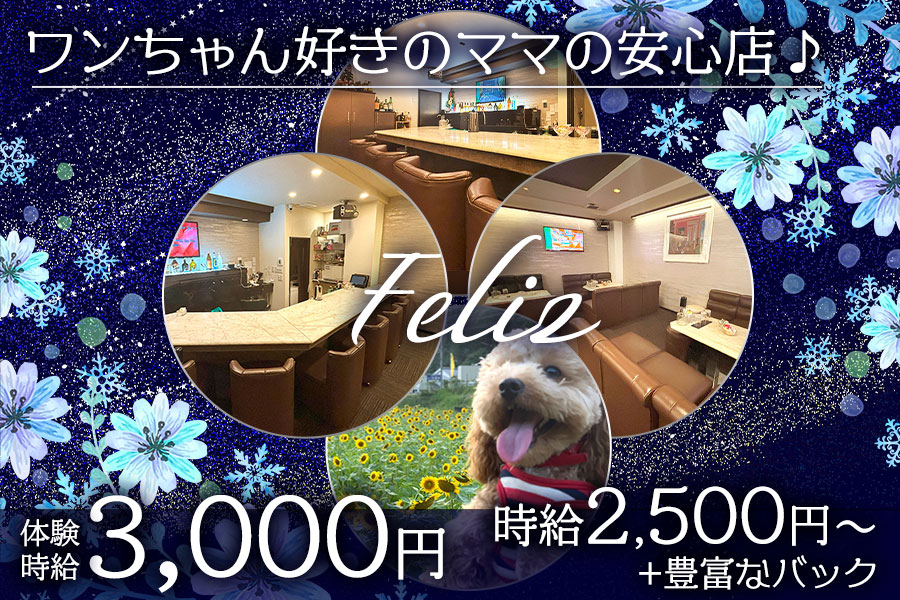 姫路のスナック「Feliz -フェリス-」でフロアレディを大募集♪愛犬にデレデレの犬好きママは、おっとり天然で女の子とも仲良し★"女の子ファースト"のお店なので、ヘンなお客様はママが出禁にしています◎客層抜群の安心環境で、厳しいルールも一切なし♪なのに《1日10万円以上》稼げる高待遇!20代~30代活躍中!