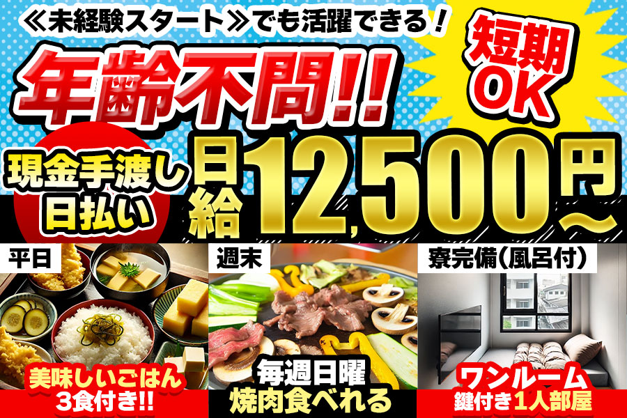 | 待遇・福利厚生 | ■即入居可!1人部屋&鍵付きの快適な寮完備 冷暖房・自分専用のテレビ・ベッド・Wi-Fi完備! 朝・昼・夜の3食・お風呂・無料の洗濯機付きです! さらに毎週日曜日はホットプレートで焼肉が食べられる!! 特に節約しなくても自然に貯金できます☆ ■運転手当・諸手当有 ■全額日払い・週払いOK ■現金手渡し →即現金ゲット可能!! お金に困ったときでも 欲しいものがあるときも安心☆ ■車通勤OK! ■髪型自由 ■作業に使う服や靴などは貸出あり →寒い日は防寒服も支給◎ |